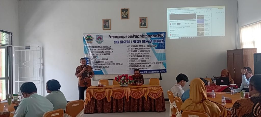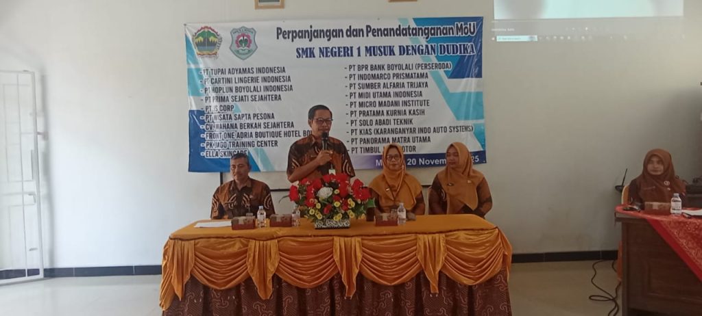 BOYOLALI, SMK N 1 MUSUK – Kamis, 20 November 2025 menjadi hari bersejarah bagi SMK Negeri 1 Musuk. Dalam upaya memperkuat ekosistem pendidikan vokasi yang relevan dengan kebutuhan zaman, sekolah ini sukses menyelenggarakan agenda besar bertajuk “Penandatanganan Nota Kesepahaman (MoU) Strategis Bersama 20 Mitra DUDIKA (Dunia Usaha, Dunia Industri, dan Dunia Kerja)”.